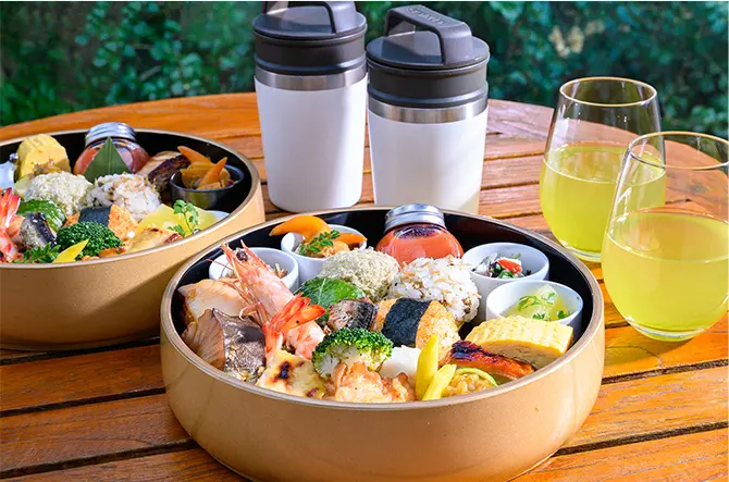 由料理長精心特製的「森林早餐」則是以餐盒型態提供,將伊勢志摩食材濃縮通通裝進餐盒裡,繽紛色彩的配色讓人光用看的就食慾大開,帶著餐盒在度假村裡挑選自己喜歡的角落,一邊享用早餐、一邊欣賞心曠神怡的海景,享用野餐的樂趣。