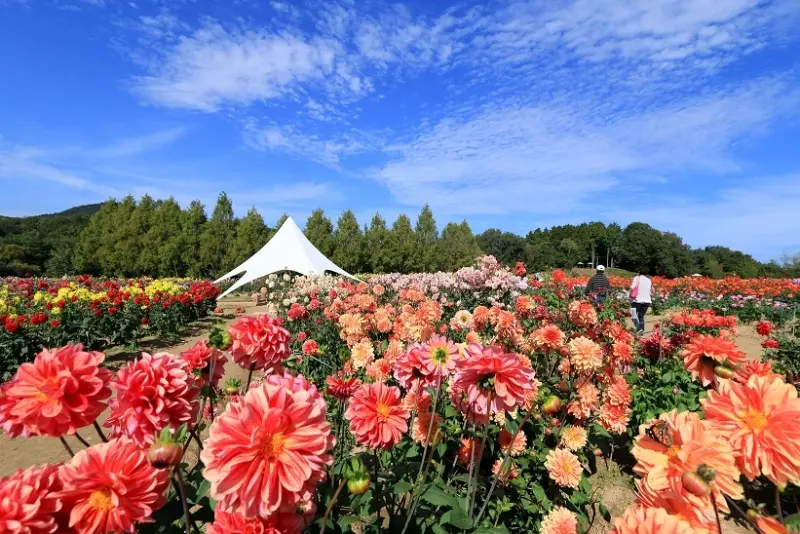 世羅高原農場是日本相當著名的賞花景點,可隨四季更迭欣賞到各種美麗花海,經職人們細心規劃及種植,並利用花的形狀與顏色,巧妙打造如藝術作品般的花海,絢爛繽紛,美不勝收!秋天到來,盆菊以球狀造型可愛登場,多達一萬兩千株的盆菊,不同繽紛色彩堆疊交錯,十分壯觀;雍容華貴的大理花也是秋季嬌點,多達八千株大理花呈現的各種圖案,是每年都備受關注的花海藝術。