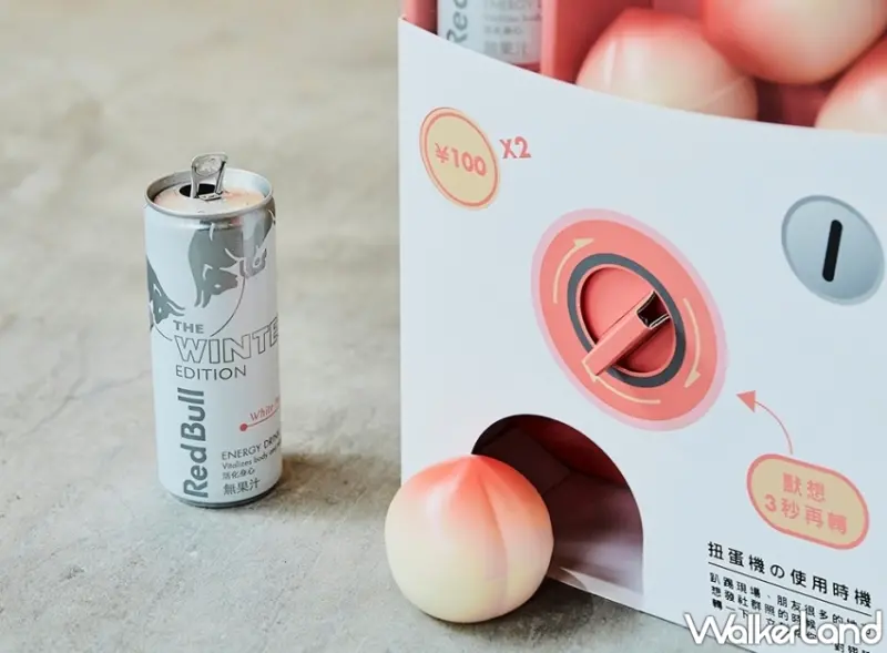 即日起開啟IG濾鏡拍攝完整鑑定影片並@redbulltaiwan,即有機會獲得全台限量的Red Bull Winter Edition白桃扭蛋機禮盒(市價$990)。俏皮討喜的扭蛋機裡藏有五顆幸運白桃,轉開白桃還可獲得推薦飲品喝法,只送不賣。