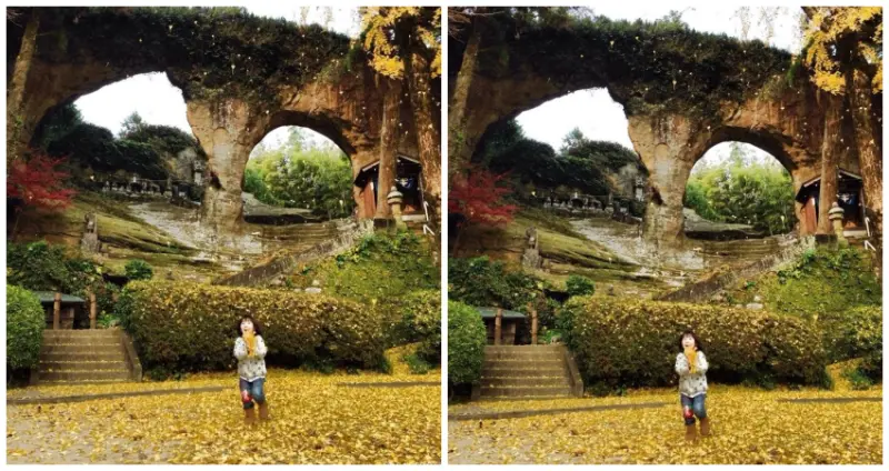 平戶八景之一的眼鏡岩是個高達10公尺、寬約20公尺、巨大如屏風的岩石,岩石上開了兩個渾然而成洞穴,彷彿就像是一副眼鏡。這裡秋天時不僅有紅葉,還能欣賞到巨大銀杏樹的無敵美景。![]()
