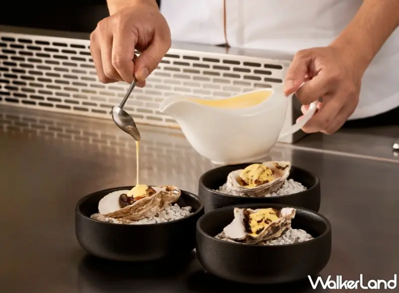 其中,廣島牡蠣就是搭配五大法式母醬之一「荷蘭醬」,口感如天鵝絨般滑順,濃郁奶味與柑橘酸香元素巧妙結合,點上黑金美味魚子醬,珍饈鮮滋在味蕾中奔放,入喉後鹹鮮美味持續淡淡散出,吃一口就懂、好的醬料讓食材變的更美味。