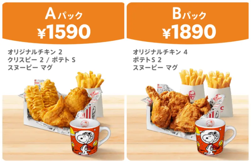 價格:A套餐1,590日圓、B套餐1,890日圓、炸雞套餐1,290日圓、漢堡套餐1,290日圓、4入馬克杯特別套餐5,200日圓