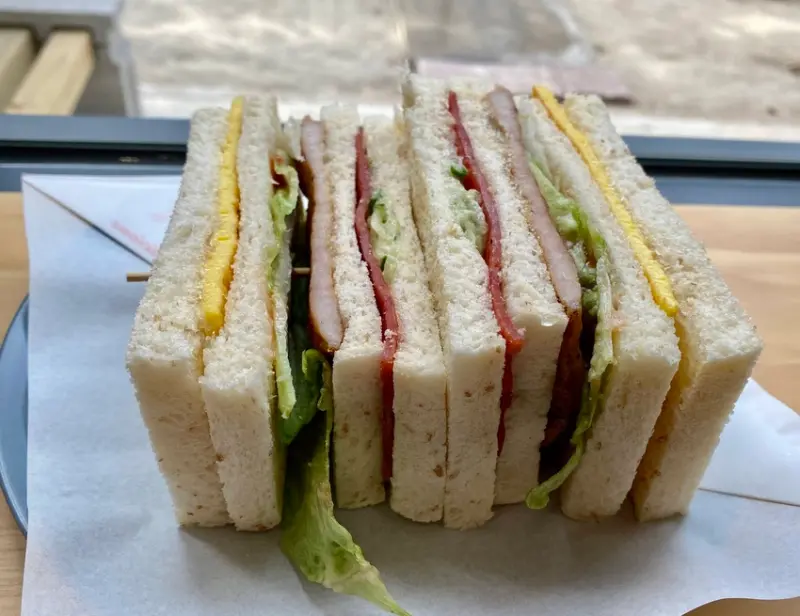 總匯三明治的肉排似乎不是組合肉,有相當的厚度也讓人驚訝,通常傳統早餐店的總匯三明治都是用組合肉,也不會太厚啊。<全文介紹>