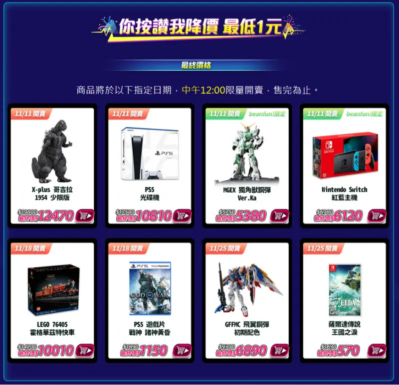 不管你現在想買什麼、不管是不是會對不起錢錢,1111雙11就是買自己喜歡的東西、就是要參加電商平台舉辦的期間限定活動。Gamania 橘子集團旗下有閑購物為了寵愛粉絲,不只推出全新的下殺優惠,更加碼推出「你按讚我降價」活動,PS5主機、巨大哥吉拉賣多少由網友決定!11/11中午限量開搶。![]()