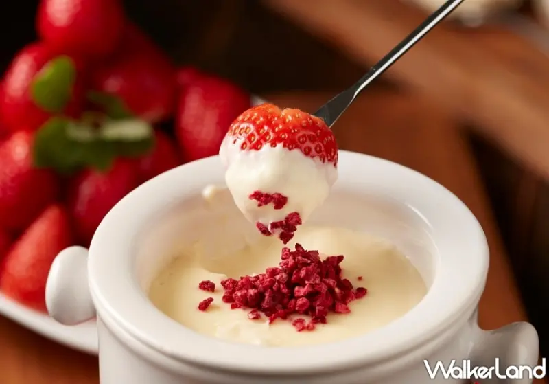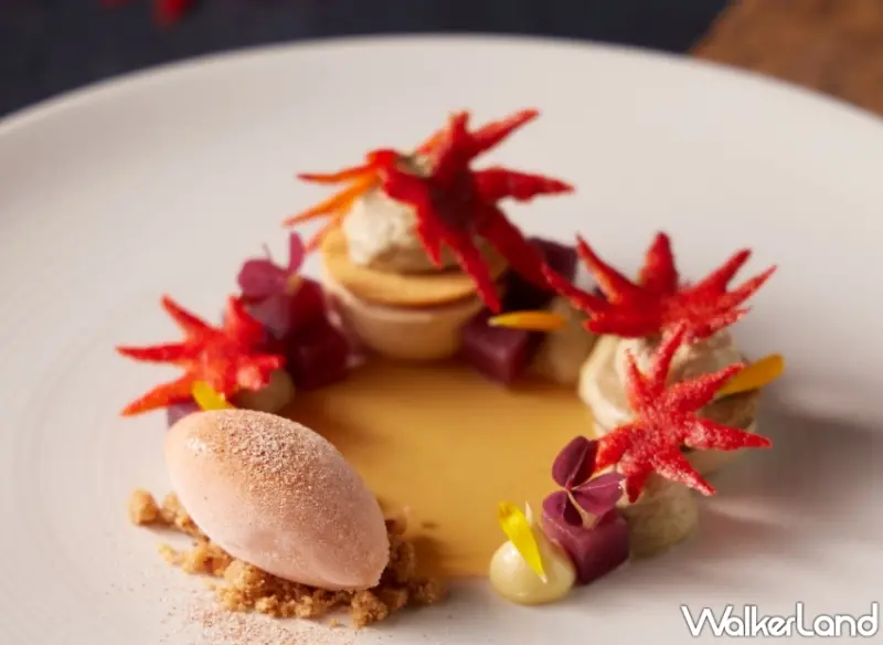 最後,「嵐山」這道甜點則是甜點師對京都秋冬的懷想,取清秋轉冬之際,嵐山的楓葉由黃漸轉紅,以優雅姿態飄落水面的意境。整體甜點以茶為主要架構,清新颯爽,並搭配紅心芭樂雪酪,別有一番風味。同時還有,季節限定「大湖草莓起司鍋」,產地直送新鮮大湖草莓,香氣迷人,搭配主廚特製香熱濃郁的起司醬汁,有著Cream Cheese的酸香、Mascarpone的濃郁滑順、伊斯尼鮮奶油的細緻口感,並搭配青蘋果香甜酒提味,彷彿拆解一顆香濃可口的草莓起司蛋糕。