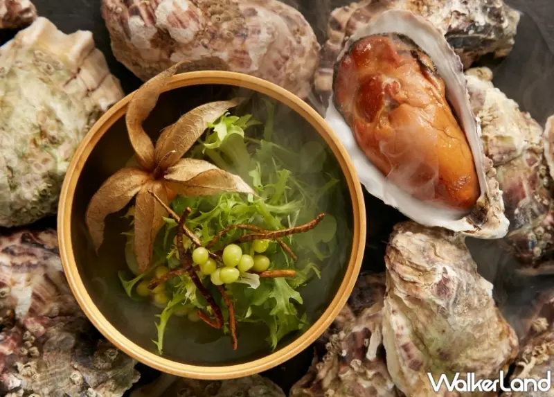 而在12/7即將推出以「浮現」為意象的冬春新菜色,浮現除了象徵台灣這座四面環海的漂浮之島外,也深化食物與記憶的連結,期待顧客在嗅、觀、品、嚐的過程中,開啟想像,創造更佳深刻的用餐體驗。其中,「茶燻生蠔沙拉」以東方美人茶煙燻,為鮮甜飽滿的生蠔增添一抹茶香,佐以魚子乳酪醬,並搭配無籽葡萄、生菜苗與小黃瓜檸檬醬汁,酸香開胃,整體口感豐富有趣。