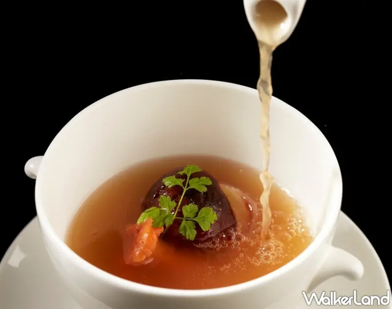 此外,新湯品「蕈菇老母雞湯」為開幕之初的湯品,好評再回歸,改編自主廚記憶裡的餐桌滋味,一碗湯飽含了整隻老母雞、伊比利5J火腿與蔬果的精華,看似清澈澄靜,嚐起來卻帶有膠質的豐美與綿密,搭配乾煎蕈菇,滋味深邃。