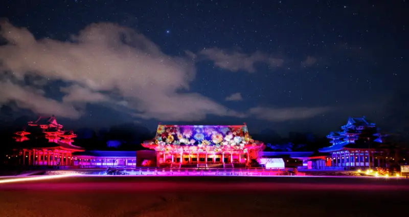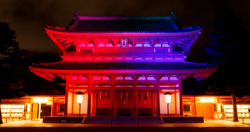 結合燈光與音響效果,整座平安神宮化為燈光藝術秀的舞台,耀眼奪目的花卉投影與傳統建築相互輝映,形成夜晚最夢幻的美景。![]()
