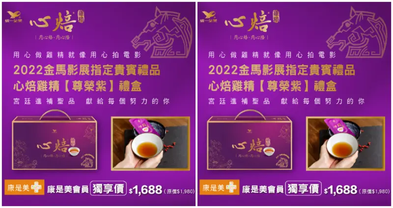 2022第59屆金馬獎完美落幕,堅持「用心焙,用心陪」做出好雞精的「心焙雞精」,對於禮盒包裝、製作工序、食材用料的堅持,如同用心拍出好作品的電影人,心焙以宮廷「尊榮紫」限定禮盒,致敬金馬59入圍者及貴賓。![]()
