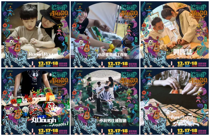 除了職人手作,還有其他適合親子一起參加的特色體驗課程,包括推廣「生活陶美學」的 Round Round此次也設計適合親子同樂的捏陶體驗,不管是自用或是贈禮都充滿獨特的心意;小花雀藝術工作室特地為這次的音樂祭提供限定小花雀耶誕薑餅屋課程,為這個冬季帶來甜甜的儀式感;興趣誌則帶來特別的植物昆蟲標本課讓更多的朋友用輕鬆無壓力的方式享受大自然的各面向之美;丸Dough透過分享如何利用日常生活中隨處可得的素材,經過巧思變成一件件獨特的親子共同創作。想要換新造型,那就千萬別錯過即將開剪不純男仕理髮廳幫你設計出適合的髮型;最後,來到Camp de Amigo還有塔羅牌牌可以算喔!Amethyst Tarot從個人星際馬雅圖騰解讀到塔羅指引,這次將為Amigos提供從圖像對應直覺與潛意識對話,認出與跟隨內在,為你帶出最真實的想法指引方向喔。
