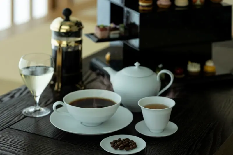 茶事的主角「濃茶」,是將泡好的濃茶裝在一只茶碗,出席茶事的人們輪流共飲,「虹夕諾雅 東京」仿效此方法,但以法式濾壓壺來提供咖啡,並在猿田彥珈琲協助之下選定頂級咖啡豆,為配合主菓子的柑橘及櫻花等較清爽的口味,使用能感受到莓果果香與微苦滋味的豆子,並採用「厭氧發酵處理法」使咖啡豆發酵的手法以搭配發酵食材。