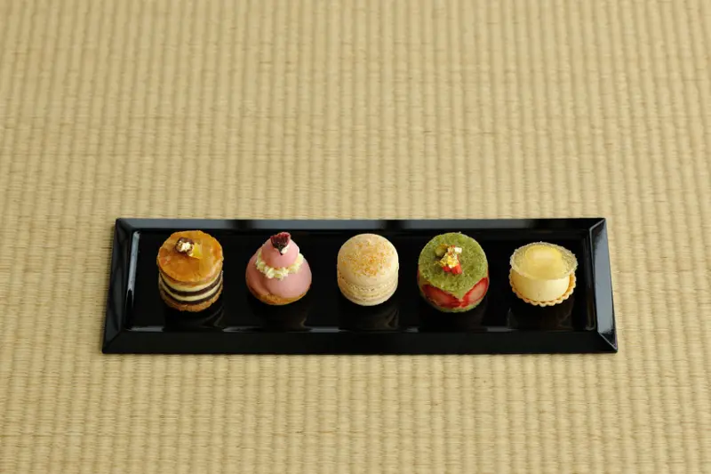 主菓子:紅豆泥千層(發酵紅豆)、櫻花修女泡芙(發酵奶油)、江戶味噌馬卡龍(江戶味噌)、草莓開心果法式草莓蛋糕(酪乳)、湘南黃金柑愛之井(發酵薑漿)。