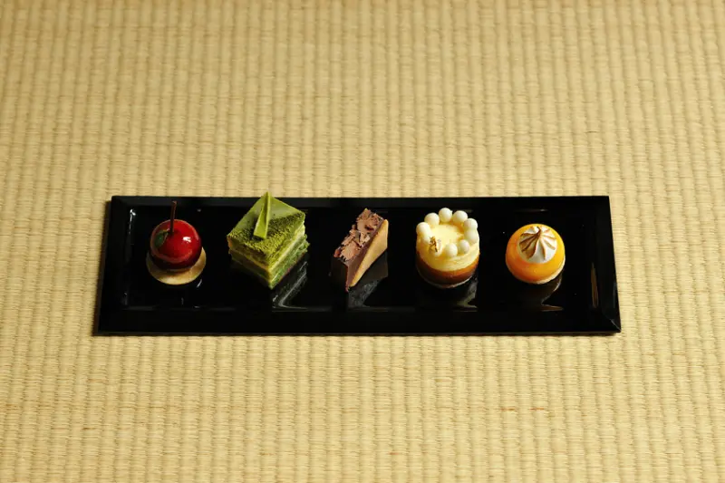 干菓子:櫻桃慕斯(櫻桃利口酒)、艾草歌劇院(發酵茶)、黑文字茶巧克力夾心(巧克力)、金柑與巧克力的慕絲(柚子酵素糖漿)、和柑橘檸檬塔(發酵檸檬)、亞馬遜可可落雁(可可)。