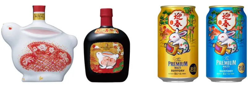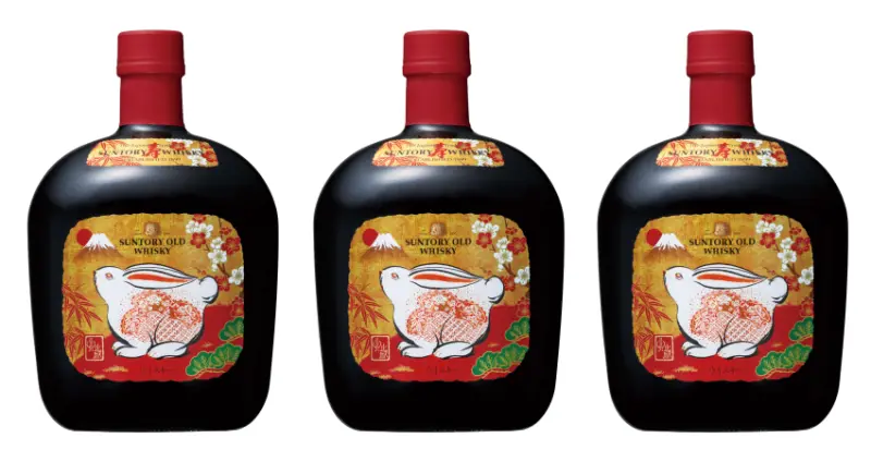三得利老威士忌則以經典黑底瓶裝再現風華,酒標上貼有與皇家威士忌同樣造型的兔子繪圖,兔子周圍同也也被松、竹、梅與雄偉的富士山圍繞,加上鮮豔雅致的大紅色瓶蓋,為低調典雅的瓶身染上一股華麗的氛圍,為新年更增添喜氣。