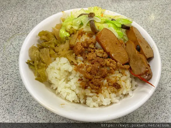 不管是雞腿飯或者排骨飯的飯上都會放上酸菜、高麗菜、滷豆干,最後再淋上肉燥,完成便端上桌。美味程度一般,調味與炸排骨、雞腿相比偏清淡,搭配口味較重的肉很剛好。<全文介紹>