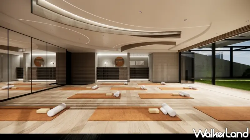 同時,山闊館「沃野書室」,以東方療癒文化為主題,匯集了「中醫、瑜珈、心靈、阿育吠陀」等書籍、圖右為多功能教室「淨境」,於此提供靜心瑜珈及多元體驗課程。此外,「茶覺」則是提供能量瑜珈茶、舒緩香料茶等茶品,讓旅人從裡到外、感受最自然的平靜。