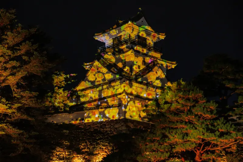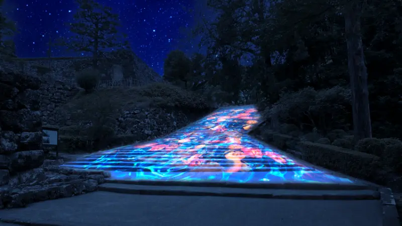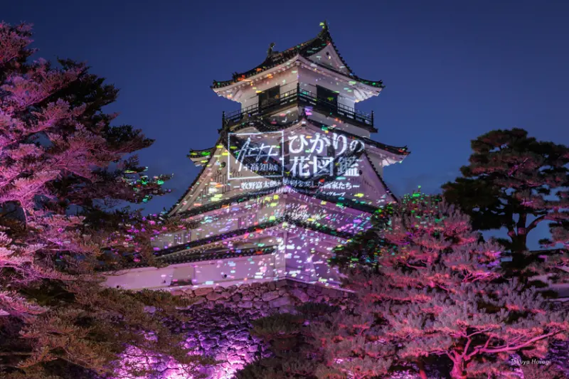高知城天守每15分鐘會上演一次光雕投影秀,以動感、活力的聲光效果展現花草生命力,顏料豪邁地潑灑後,花瓣隨風吹撒、隨水傾瀉而下,搭配臨場感十足的震撼聲效,使得天守在絢彩繽紛花卉的包覆下進入燈光秀的最高潮,也將遊客帶領到當時牧野富太郎、莫內、梵谷、雷諾瓦身處的花花世界。![]()