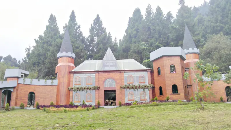 登上兩層樓的玻璃城堡,遠望可以看見城堡前寬闊的草皮,這木製的城堡可是個綠建築呢!使用強化玻璃和台灣杉木建構而成!在地取材、融合地方特色為一體,在煙霧飄渺時特別吸引人!