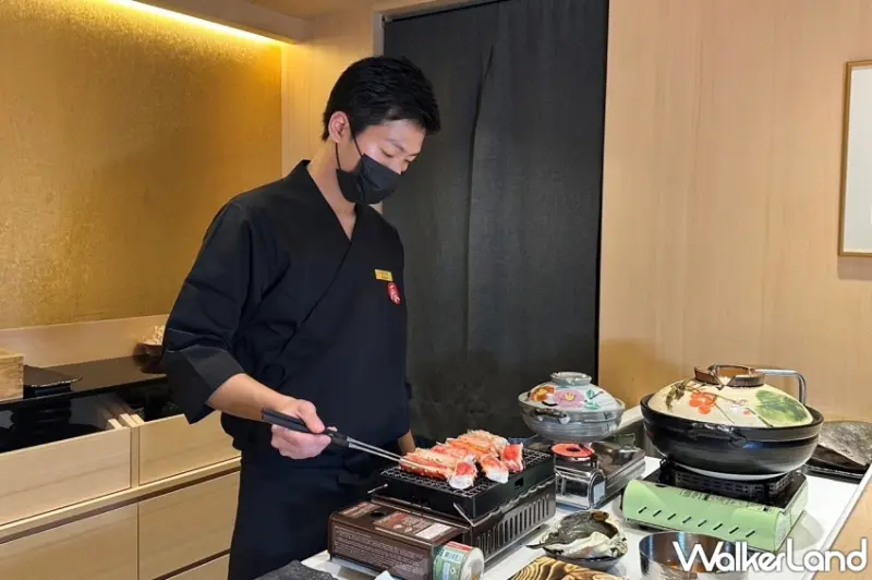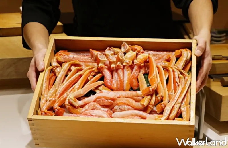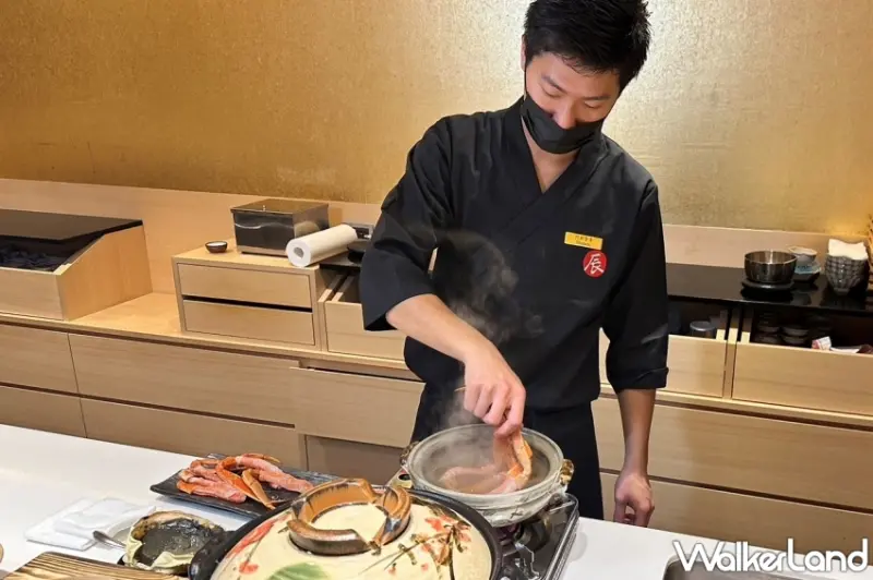 本次「鱈場蟹+松葉蟹」雙活蟹會席,每位8,800元,可以品嚐松葉蟹刺身、鱈場蟹腿肉鹽燒、松葉蟹腿涮涮鍋、蟹肉茶碗蒸、鱈場蟹腿肉天婦羅、松葉蟹肉鱈白子柚子釜燒多達11道料理。其中,「先付蟹肉 茶碗蒸」一開場就讓要讓老饕十分驚豔,採用低溫烹調的手法、讓蛋的香氣與蟹肉完美融合,是在冬季品嚐美食時最棒的開胃暖身料理。