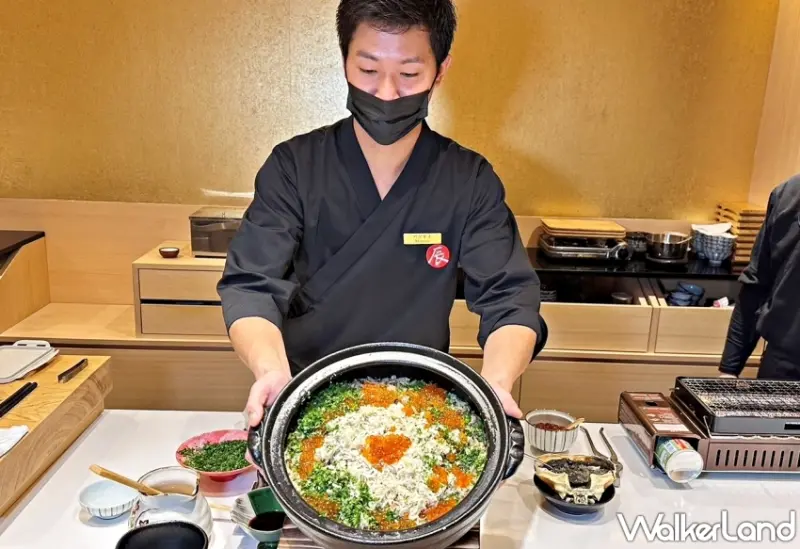 同時,要讓老饕們多一層飽足感,料理長端上「食事 蟹肉 土鍋飯 」,將蟹肉、高湯與多種蔬菜蒸煮而成,在上桌前,在加入蟹膏、鮭魚卵提味,希望讓老饕們在有飽足感的同時,還能品嚐到大海鮮味、蟹味的甜美,及米飯的香味,並且料理長表示,這道料理是唯一提供「續加」的服務。