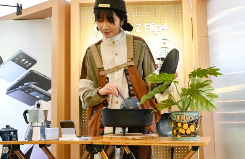 ●Galaxy Z Flip4露營炊事區:露營時一定會常常跟朋友一起野炊,野炊同時,除了可以看別人的下廚影片,參考學習之外,很多人也會縮時錄影,為自己的露營生活做紀錄!在此區除了可以運用Galaxy Z旗艦摺疊的Flex mode多角度拍攝功能來進行多變風格的影片紀錄,也能體驗到Galaxy Z旗艦摺疊結合Google 助理的便利性,只要直接說出指定字串 「Ok Google」,叫出Google 助理,就能夠邊尋找自己喜歡的食譜與多角度拍攝來進行。