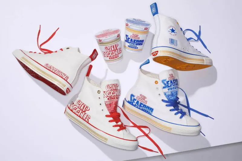 知名的杯麵品牌「日清」除了推出各式各樣新穎的泡麵口味,還致力於開發各項稀奇有趣的周邊商品,像是泡麵加濕氣、泡麵汽水、泡麵手機殼等,每每發售都幾乎引起瘋搶,最新力作則是與CONVERSE的人氣帆布鞋「ALL STAR」所推出的3款聯名休閒鞋,包含了高筒、低筒兩種款式,圖案分別是「原味醬油泡麵」、「海鮮泡麵」與低調的「黑底成份包裝」。