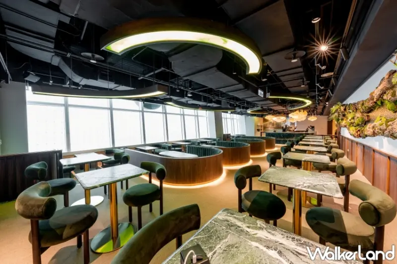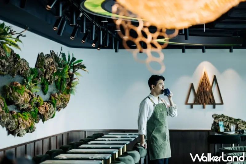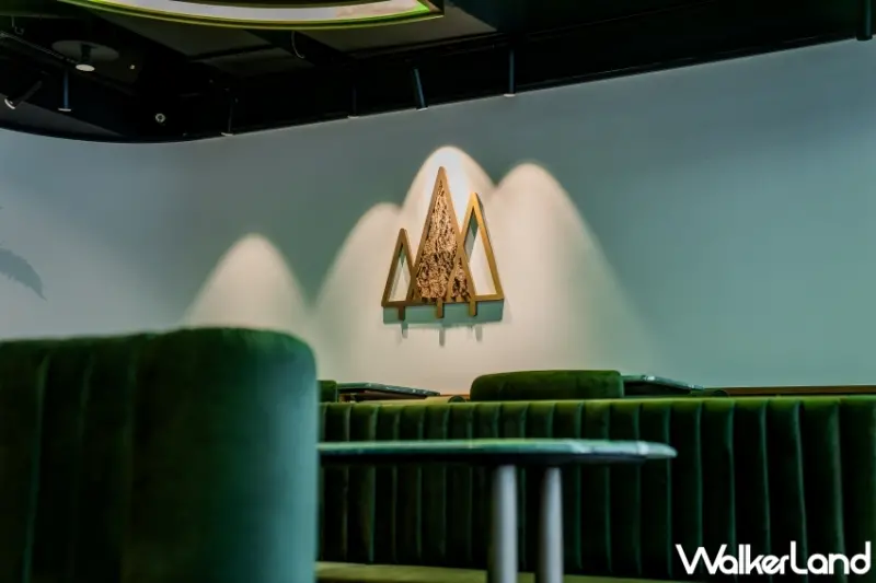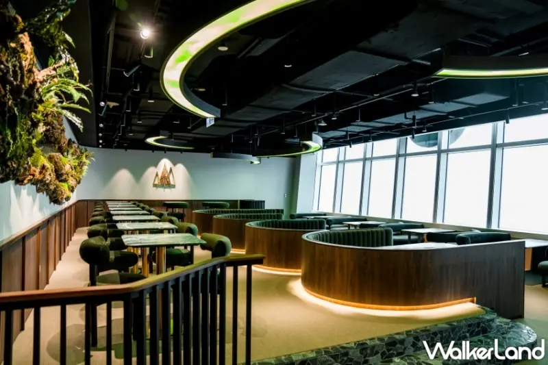 座位區背牆上長達11米的大型藝術裝置,則是硬是設計與「煙花蕨醒 Hanabi Plant」所共同創作,以經過處理的栓皮櫟樹皮,迤邐拾綴永生苔綠,模擬距今5000年前,古台北大澤漸漸乾涸,蜿蜒的淡水河階浮出地面,兩岸森林幽靄蓊鬱的地貌,比對現今在台北101窗前俯瞰的淡水河岸,台北5000年前的起點與窗前的文明盛世,穿越時空相映成趣。有別於奧匈帝國知名作家卡夫卡名作「城堡」中,主角K無盡的追尋,天空興波不只是對於一杯好咖啡的極致追求,也是另一個新的起點。