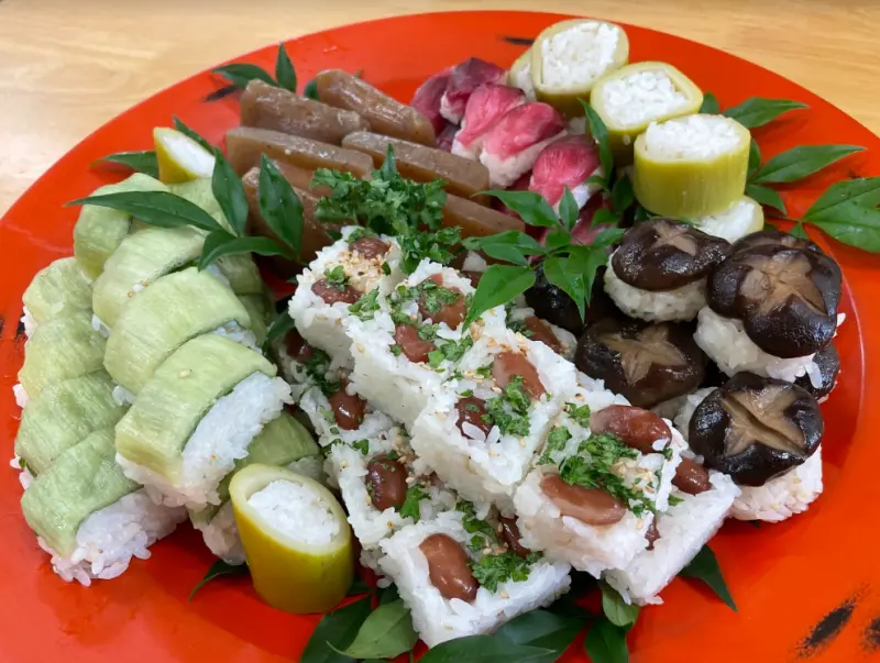 田舍壽司是使用時令食材製作的蔬食壽司,竹筍、琉球莖、茗荷、香菇、蒟蒻等,食材根據地區和季節有所不同,是高知著名的鄉土料理。以高知特有的山村食材挑戰製作壽司捲、握壽司、以及蒟蒻包壽司等體驗,對於國外的觀光客來說,一定也相當特別。![]()