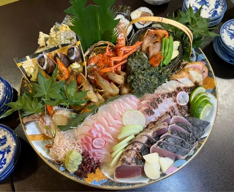 除此之外,談到高知縣美食,就不能錯過最能代表酒豪王國的宴客料理「皿缽料理」,起源自17世紀江戶時代流傳至今,現今仍是高知人的宴會桌上必出現的的鄉土料理。皿缽意為「大拼盤」菜色豐富且擺盤精緻。以大盤盛裝是為了讓客人可隨意夾取,且宴會主人不必一直備菜可與客人同聚一堂,悠閒地享用佳餚而來。皿缽料理分為包含炙烤鰹魚、鮪魚、青魽等各類海鮮的「生魚片拼盤」,和以壽司為主的「組物拼盤」。組物常見魚類壽司、壽司卷、燉煮料理、燒烤料理、油炸料理,甚至還會有水果和羊羹等菜色,五顏六色讓人目不暇給。![]()