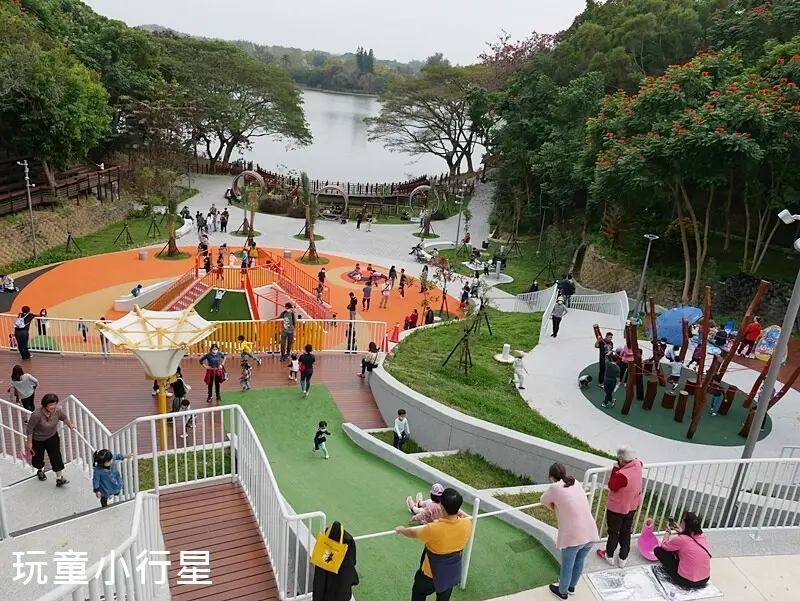 這天我們到訪主要是來玩遊戲區,原本的滑水道非常老舊,拆除整建成特色遊戲場,造福更多親子族群。遊戲場的位置在進入園區後左轉步行大約1KM處,遊戲場內有攀岩山丘、磨石滑梯、小隧道、星月吊椅、木製攀爬架、滑草坡...<全文介紹>