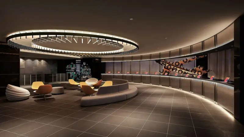 飯店1樓設有停車場和機場巴士停靠點,2樓可與車站連通,在服務台迎接旅客的是OMO設計的原創飛機;飯店內另設有公共空間,無論是要規劃行程,還是要稍作休息,都能輕鬆自在地度過。整體室內設計以飛機引擎和機上座席為靈感,讓旅客體會到旅程即將展開的雀躍感。