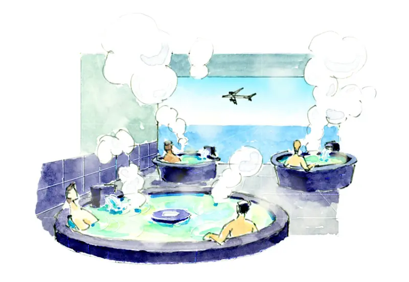 喜愛泡湯的話,「OMO 關西機場 by 星野集團」的大浴場同時設有內湯和半露天風呂,內湯區設有三溫暖和水風呂。半露天風呂的牆壁上投影著能體驗日本四季與文化的圖像,旅客能在此愜意泡湯,享受療癒的愉快時光。