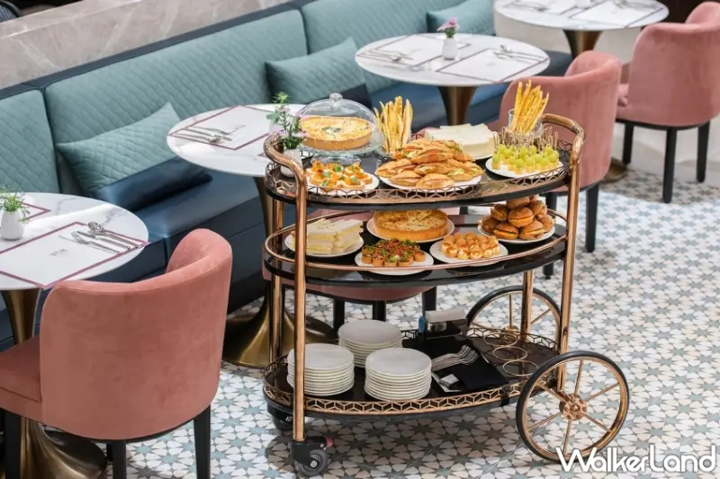 除了優雅的室內設計,全新的歐風下午茶推車吃到飽,以歐式雅緻奢華為靈感,特別訂製高質感三層玫瑰金花邊午茶推車,擺放多達30種以上甜鹹美點,營造溫柔曼妙的歐洲仕女午茶饗宴。其中,經典鹹食主廚推薦「黑松露菌菇小鹹塔」,濃郁菌菇香氣,融合黑松露香,入口滿是奢華滋味;「鮭魚菠菜鹹派」 ,派皮香酥可口,佐以燻鮭魚、菠菜、蛋液,香濃不膩口。