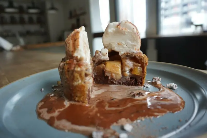 冬季限定甜品「巧克力蘋果派」也是不容錯過的人氣品項之一,使用宛如草本香氣為特徵的千里達及托巴哥產的可可豆所製成的巧克力,再搭配厚實的蘋果塊、酥脆的派皮,以及融合可可豆碎粒、蘋果皮、肉桂等製成的熱巧克力醬汁,創造出豐潤且多層次的特殊口感。