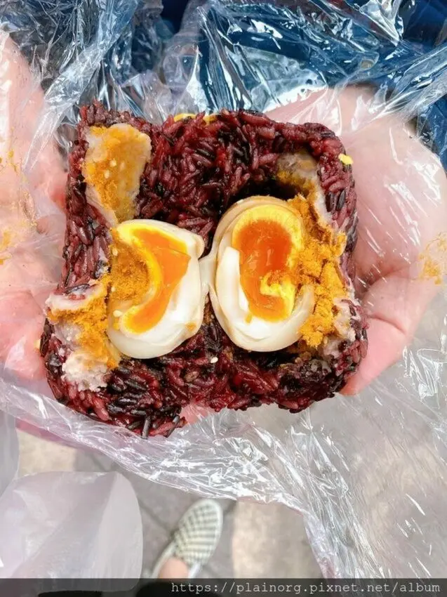 茶葉蛋香與紫米香完美結合,不同於外面一般油飯油膩感~這裡的飯糰吃起來十分清爽,邊走邊吃一不小心就吃光了!<全文介紹>