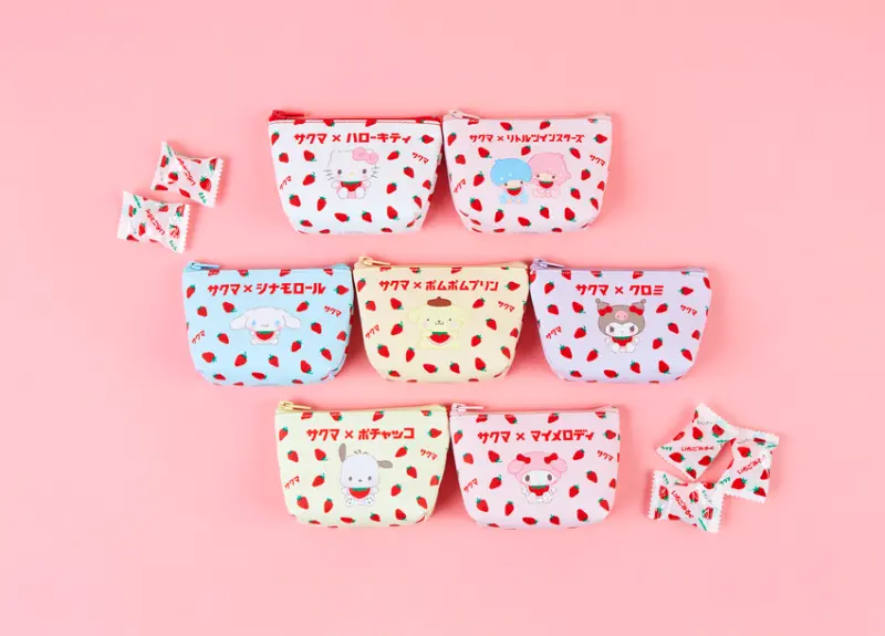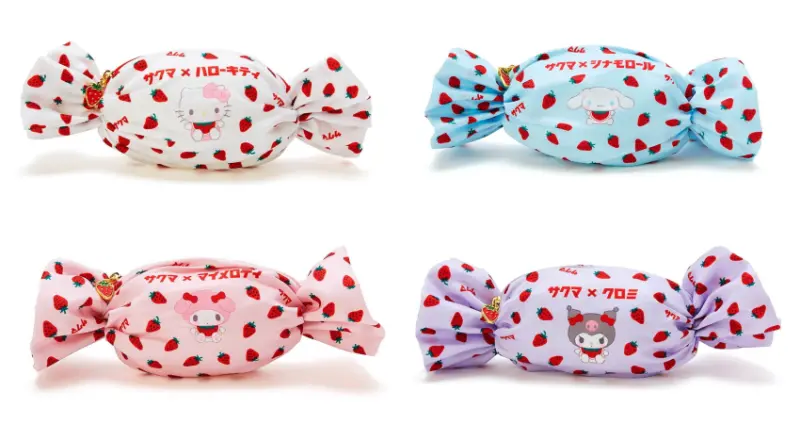 在這次「三麗鷗X草莓牛奶糖」的聯名商品當中,迷你娃娃吊飾、糖果化妝包皆有Hello Kitty、大耳狗、美樂蒂、庫洛米、帕恰狗5種版本,而心形鐵盒與一般化妝包則增加了同樣人氣也很高的雙子星Kiki&Lala、布丁狗版本,而且不管購買哪一款周邊,都會附贈真的能吃的草莓牛奶糖,讓三麗鷗粉絲倍感貼心。