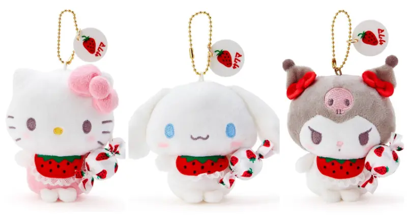 仔細一看會發現,這次「三麗鷗X草莓牛奶糖」的娃娃吊飾手上,都有拿著經典的白底紅草莓包裝糖果,而且胸前統一都繫上了草莓圖案的圍兜,瞬間化身成粉嫩的「草莓寶寶」,模樣真的可愛翻了!而這副超萌模樣,還印在各種周邊上,不管買了哪一款絕對都是療癒度爆表。