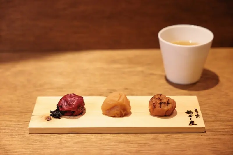 店內的人氣菜單「梅乾3顆與焙茶」,饕客可從酸度、鹹度、甜度各異的梅乾當中,任選3顆喜愛的梅乾來試吃比較。其中,使用紀州產南高梅再加入辛香料浸漬、口感微辣的「辛子梅太子」,以及使用紀州產梅子與溫州蜜柑的果汁浸漬而成、帶有爽口酸味與甜味的「蜜柑梅」,都是特別值得一試的特色梅乾。