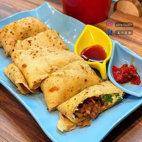 手感蛋餅皮夾入滿滿的雙色起司~趁熱拉起會牽絲,蛋餅皮香酥不膩、咀嚼的時候有著麵粉的甜味,搭配手工辣椒醬更是迷人。<全文介紹>
