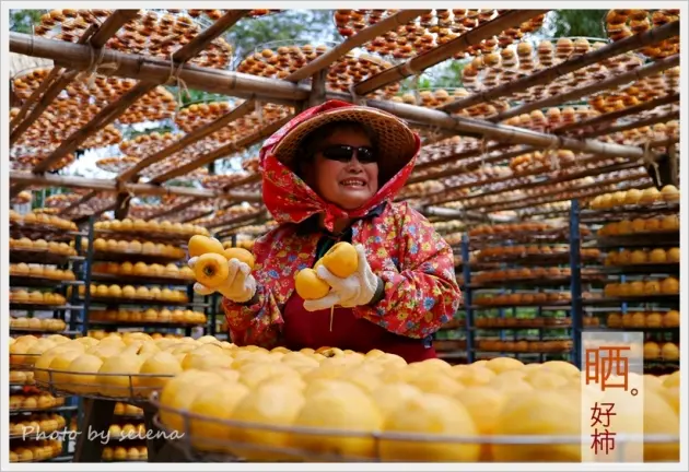 ↑有名的柿餅婆在柿子盛產季節的周末,都會出馬讓大家拍個過癮,大家可以看見柿餅婆熟練的動作,穿梭在黃橙橙一片柿海中!
