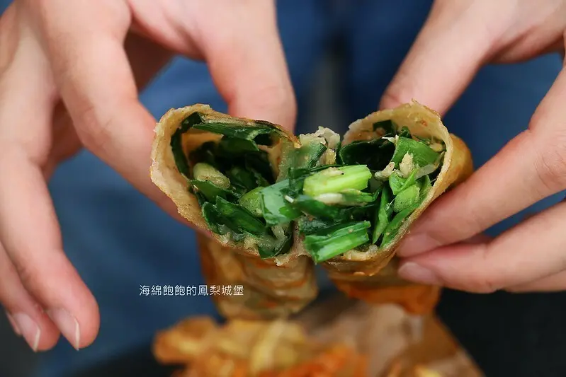 春捲尺寸不小耶,一條長約有20公分,整條都塞了滿滿的韭菜,咬下去很啾西!趁熱吃會爆漿,要小心燙口唷!<全文介紹>