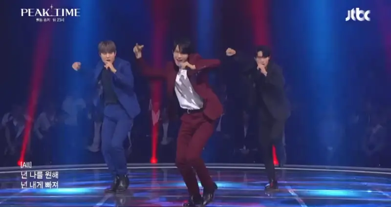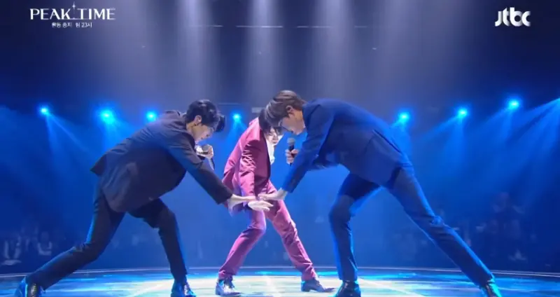 《Peak Time》全場最資深前輩大國男兒以23點壓軸出場,打造出他們的製作人金慶郁曾與H.O.T.、神話和東方神起共事,當年5位成員出道時,因擁有優秀嗓音與跳舞實力,被譽為「東方神起第二」,但團體並未如預期大紅大紫,在出道6年後進入了長時間的休息期,直到2023年3位成員InJun、Karam、Jay再戰《Peak Time》,其中Karam像極了金在中、金俊秀的唱腔,超強大的默契演出,勾起了粉絲濃濃的青春殺,尤其他們是13年歌壇大前輩,以自身經驗告訴大家「不要放棄」,還想當偶像的夢想感動眾人。![]()