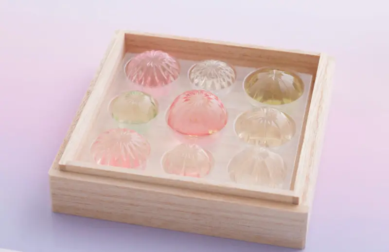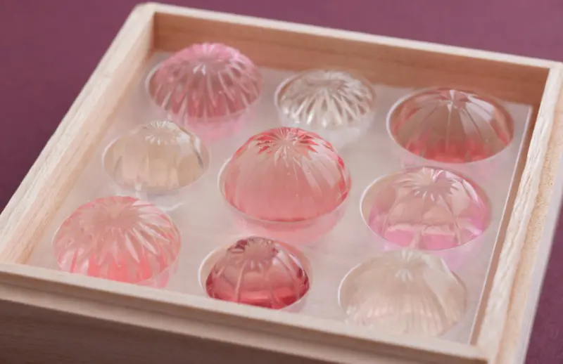 薄冰本舖五郎丸屋第16代的當家渡邊克明在2022年10月的時候,正式和玻璃造型藝術家山本真衣合作,打造具有玻璃質感的琥珀糖。琥珀糖會根據光線的角度,折射出不同的色澤。這一系列商品被命名為「季節的探求」,當時共推出了9種口味。針對2023年情人節,又一起推出了春色的新商品。![]()