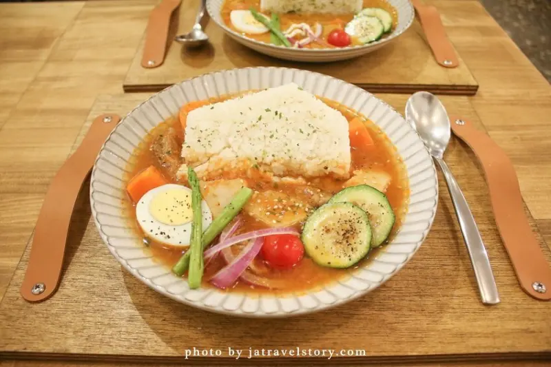 店家會使用托盤將餐點一起送上桌,在托盤左右兩側都還有皮革設計增添質感。看英文菜名是啤酒燉牛肉,中文的菜名則是用了金牌,推測應該是用金牌啤酒燉牛肉吧?米飯的口感稍微偏硬一點,外觀還使用了類似房子造型模具製作,不禁讓人聯想到他們的店名「旧宅在」呢!<全文介紹>