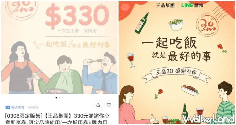 王品集團成立30週年,以「王品30謝謝你」諧音,至「LINE禮物」只要30元就可買到面額330元的內用面額券,相當於「10倍奉還」。即日起至3/31期間,每日中午12點、晚上6點準時限量開賣。此面額券可自行使用,也可轉贈朋友,包含王品牛排、西堤牛排在內,王品集團旗下20個品牌餐廳用餐均可抵用。抵用期間自即日起到4/30。![]()