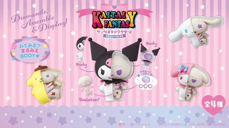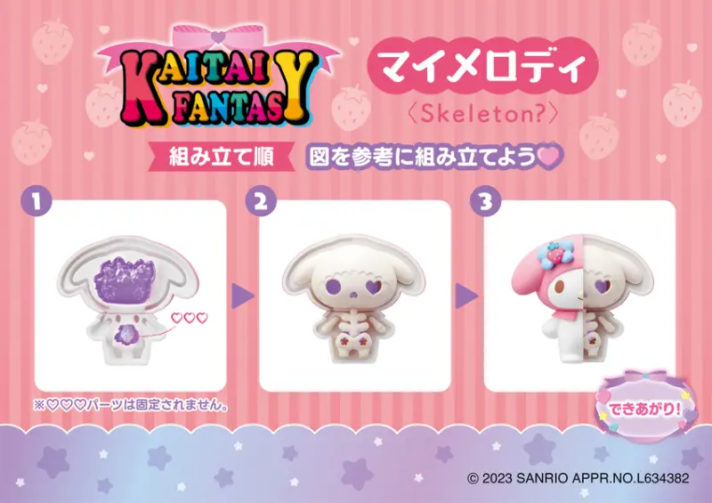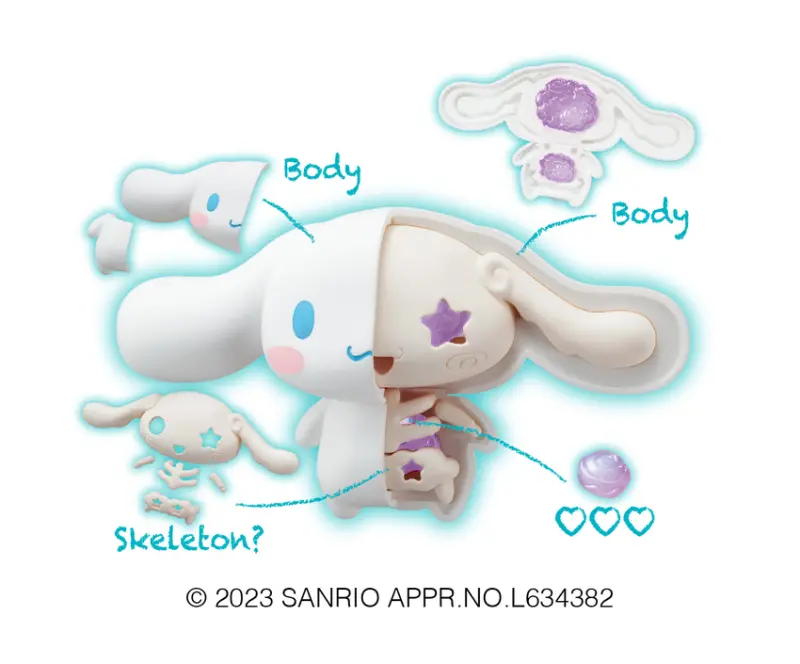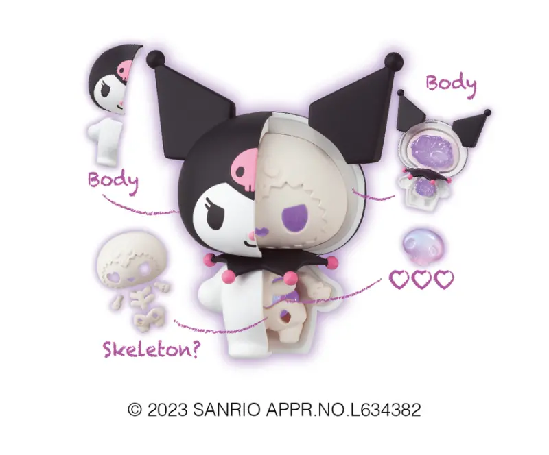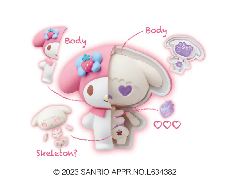 在2023年全新款式當中,美樂蒂、大耳狗、布丁狗、酷洛米共4個角色的解體模型大約分別由10個零件所組成,除了骨骼與小小的腦漿之外,可以發現軀幹的臟器還藏有小小巧思,像是布丁狗的內臟是做成布丁造型、大耳狗是肉桂捲、美樂蒂是草莓、酷洛米則是骷顱頭,完全配合每個角色的代表食物與特性,相當別出心裁,加深鐵粉們更想收藏的欲望。