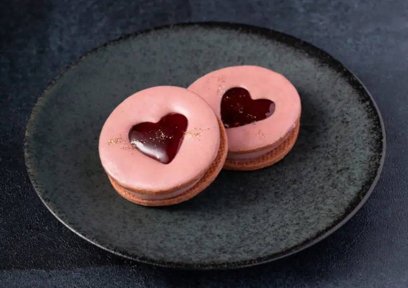 使用甘王草莓與紅寶石巧克力製成香濃甘納許,再夾入以北海道奶油及日本產小麥製成的餅皮,最後在表層覆上一層草莓巧克力,再用自製的覆盆莓果醬繪製成一個愛心。層次豐富,酸酸甜甜的夾心餅讓人一吃就愛上。![]()