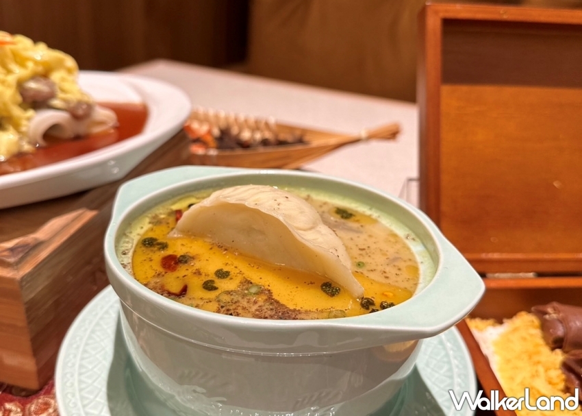 同時,還有近期的人氣名菜「酸菜魚灌湯餃」天皇朝研發主廚將酸菜魚精緻化,做成為一人也能享用的灌湯餃。以燙麵製成的餃子皮包起客家酸菜和鱸魚菲力,蒸熟置入碗盅,再沖入以煸香酸菜、青花椒增添風味的豬骨湯,皮滑餡鮮,口口生津。