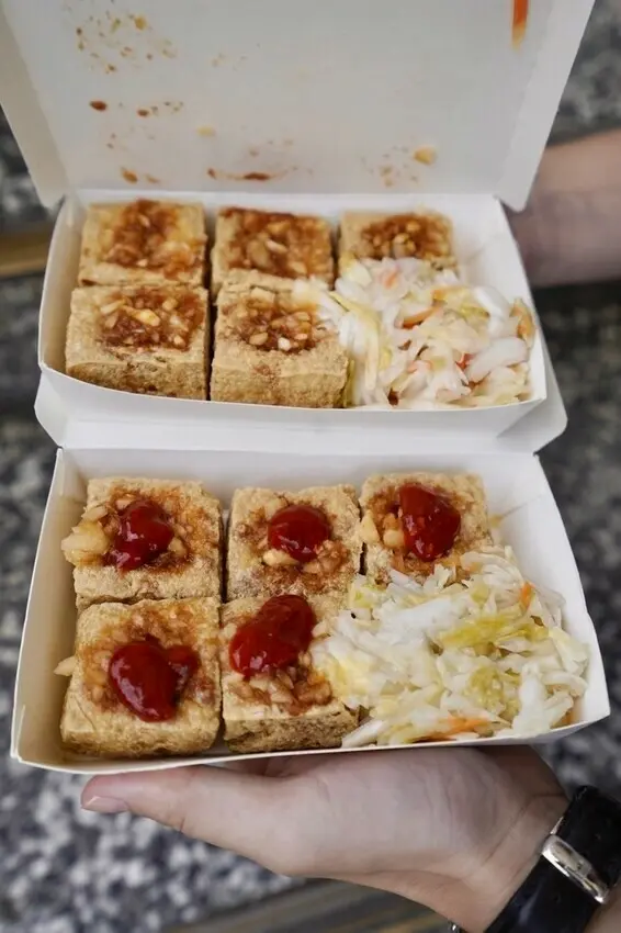 一份有60元有五塊,還有一大坨台式醃泡菜,不算便宜,剛炸馬上吃外酥內嫩,還蠻多汁的,臭豆腐上面還有放蒜頭,吃起來蒜味蠻重的,還會附辣椒醬,整體還算不錯。<全文介紹>