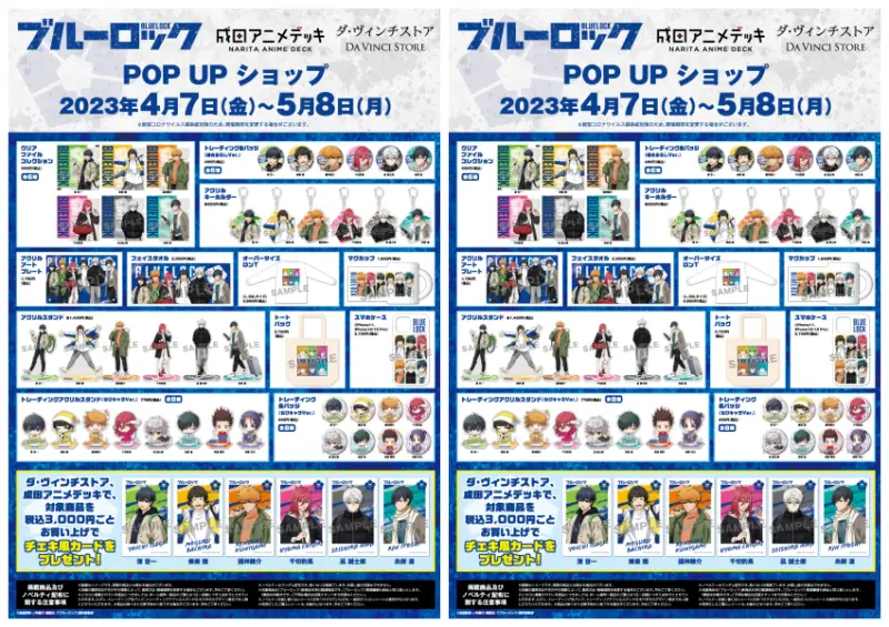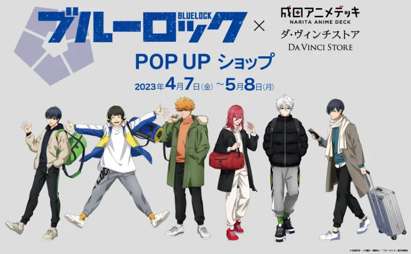 自2023年4月7日至5月8日這段期間, 所澤Sakura Town的「達文西書店」與成田國際機場的「成田動漫中心」,將同步舉辦超夯足球動漫《BLUE LOCK 藍色監獄》限定快閃店,並以「遠征」為概念,人氣角色「潔世一、蜂樂廻、國神鍊介、千切豹馬、凪誠士郎、糸師凜」6名角色將以運動服造型的插圖帥氣登場;此外更以「遠征前的睡眠時間」為主題,推出睡衣造型的Q版公仔插圖,馬狼照英、御影玲王兩人會以睡衣造型一同登場,各款主題商品均展現出角色們的活力外在與私下放鬆的不同面貌。
